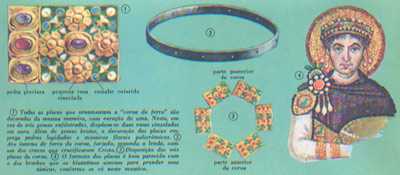 Outras características da "coroa de ferro", entretanto, confundem os especialistas, dificultando a determinação exata de sua procedência. O esmalte que recobre as placas, por exemplo, nada tem em comum com a ourivesaria de Bizâncio, nem com os trabalhos persas da mesma época. E tampouco se assemelha às obras produzidas pelos ourives lombardos. Uma série de pesquisas realizadas em 1937 indicou que o revestimento das placas foi obtido através da fusão do pó de esmeralda e aplicado sobre os alvéolos segundo uma técnica remanescente de épocas muito remotas. Contudo, também este novo dado não permitiu tirar conclusões definitivas quanto à origem da obra, que continua obscura até hoje.